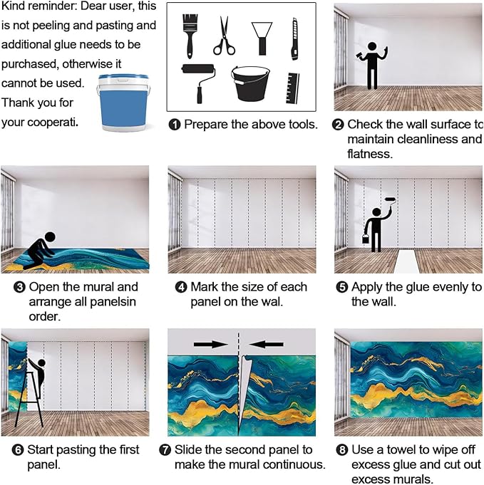 - DIY Murals: Wallpaper is not pre-pasted (need to be purchased by yourself), before installing the mural, please make sure the wall is flat, clean, dry and dust-free. Apply thick wall glue on the wall, slide the wallpaper into place to match the pattern