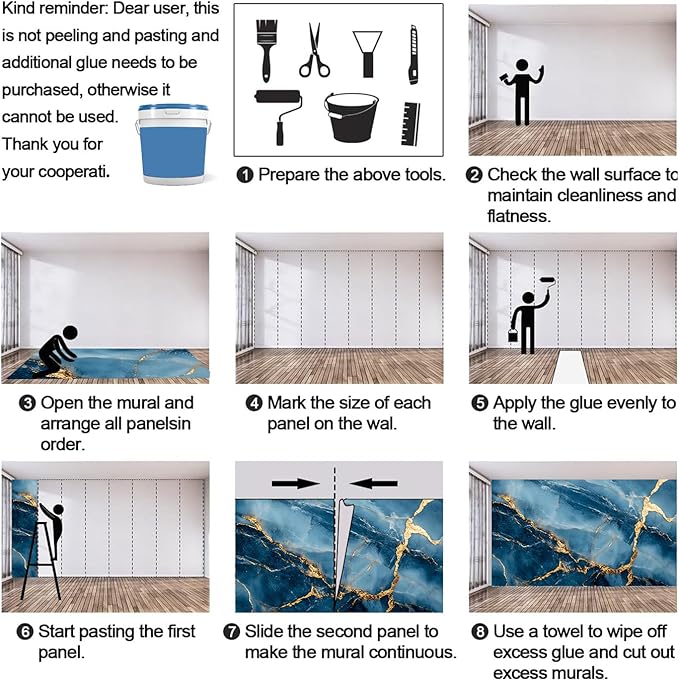 - DIY Murals: Wallpaper is not pre-pasted (need to be purchased by yourself), before installing the mural, please make sure the wall is flat, clean, dry and dust-free. Apply thick wall glue on the wall, slide the wallpaper into place to match the pattern