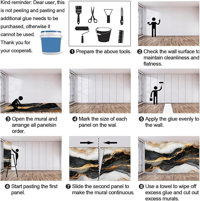 - DIY Murals: Wallpaper is not pre-pasted (need to be purchased by yourself), before installing the mural, please make sure the wall is flat, clean, dry and dust-free. Apply thick wall glue on the wall, slide the wallpaper into place to match the pattern