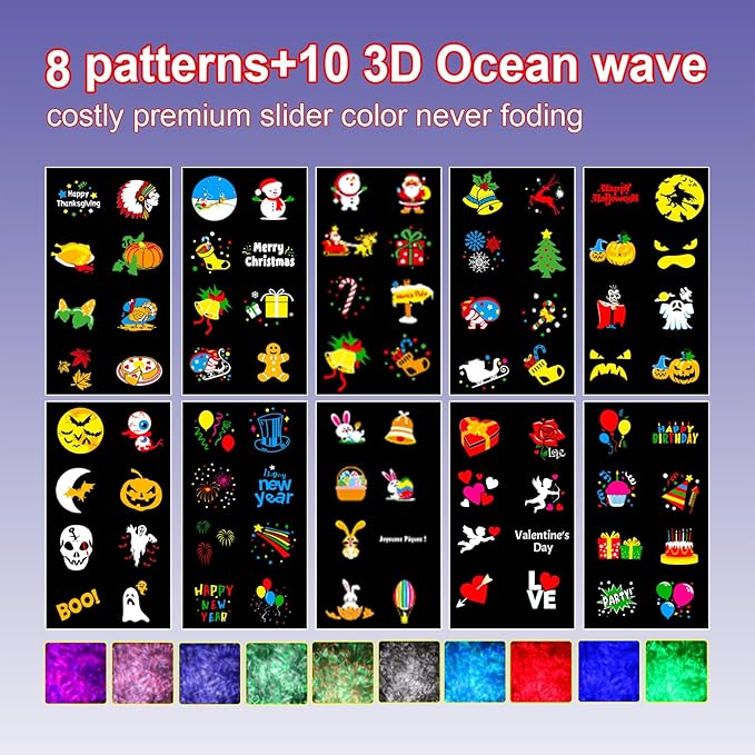 - 1. 10 Festival Slides & RGBW Water Ripple Display:This christmas light projector outdoor includes 10 interchangeable slides with vivid holiday patterns such as snowflakes, Santa, Christmas trees, and bells. Combine multiple patterns with colorful RGBW water ripple effects to create a warm, joyful Christmas atmosphere.