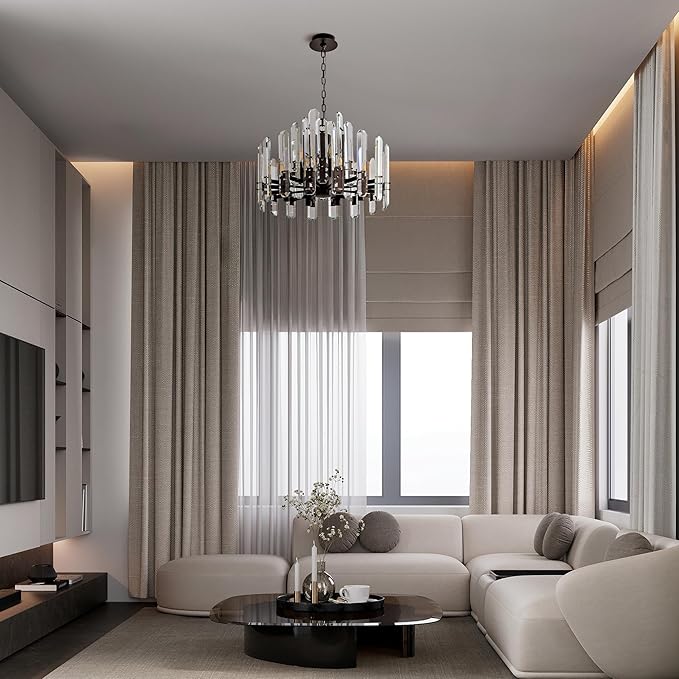 - 【Luxury Crystal Chandelier】Add timeless elegance to your home with this luxury modern chandelier. Crafted with premium K9 crystals, it creates a stunning halo effect and dazzling brilliance through perfect light refraction. The matte black finish adds sophistication, making it a statement piece for any space.