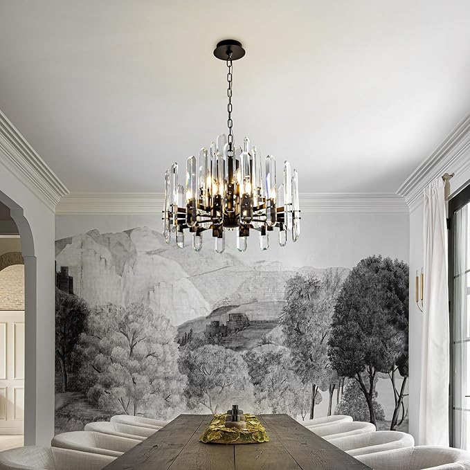 - 【Versatile for Any Room】This round crystal chandelier elevates dining room, living room, kitchen island, bedroom, foyer, bathroom, or home office. Its sparkling K9 crystals and black finish complement modern, farmhouse, and transitional décor. A luxury centerpiece that combines style with functionality.