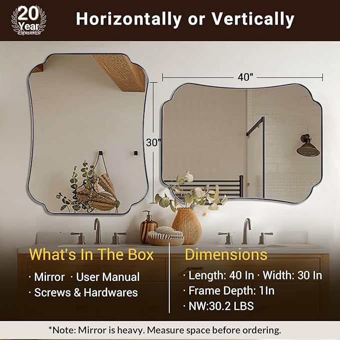- Reliable Packaging: This modern metal framed bathroom mirror is in fully protected packing with a PE bag, poly foam, and master box to ensure it arrives in perfect condition. Sturdy 30x40-inch bathroom mirror comes with four reinforced D - ring hanging clips for quick and easy installation