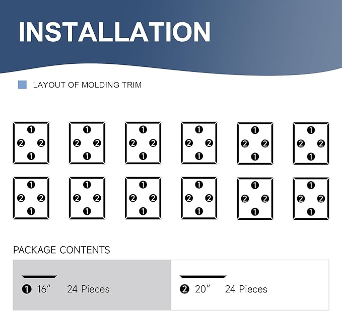 - Complete Kit - You will receive 12 sets of pre-cut peel and stick wall molding, totaling 48 pieces, which will provide an elegant finished look to your doors or walls. If you have any questions about our wall molding, please feel free to contact us. If you are not satisfied with our products, please email us first, allow us to provide professional solutions for you.
