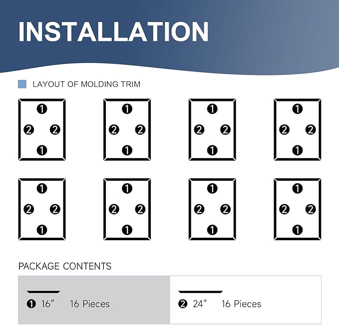 - Complete Kit - You will receive 8 sets of pre-cut peel and stick wall molding, totaling 32 pieces, which will provide an elegant finished look to your doors or walls. If you have any questions about our wall molding, please feel free to contact us. If you are not satisfied with our products, please email us first, allow us to provide professional solutions for you.