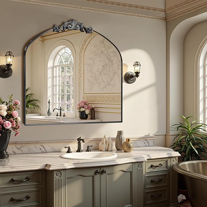 MISSDAY Vintage Arched Baroque Mirror for Wall, 36"X30" Antique Wall Mirror with Elegant Carving Top, Full Metal Frame Wall-Mounted Mirror for Bathroom, Living Room, Fireplace, Entryway, Matte Black