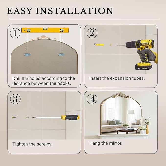 - Easy to Install: Effortlessly hang the Arched Mirror with the 2 hooks and included screws; In just a few easy steps, you can mount it securely on your wall, adding instant charm to any room