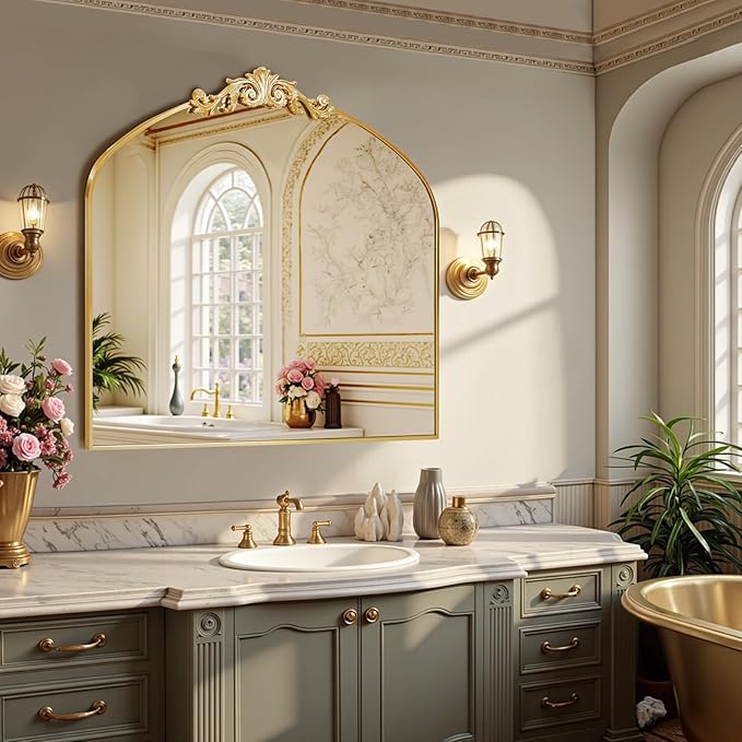 MISSDAY Vintage Arched Baroque Mirror for Wall, 36"X30" Antique Wall Mirror with Elegant Carving Top, Full Metal Frame Wall-Mounted Mirror for Bathroom, Living Room, Fireplace, Entryway, Hallway, Gold