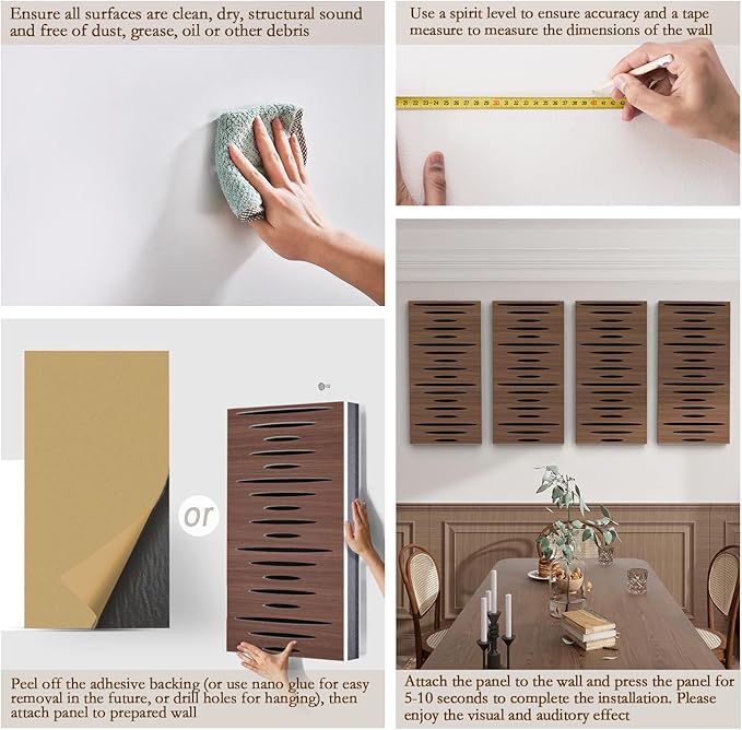 - 【Easy Installation】These decorative panels feature a modular free assembly system that supports horizontal/vertical seamless splicing. They contain high-viscosity adhesive on the entire back surface, eliminating the need to purchase separate glues. Installation can be completed in 5 minutes, reducing installation time costs by 60%. The panels are of moderate size and can be adapted to walls of various sizes. Installation is flexible, and users can DIY. If you need to remove the sound-absorbing panels, it is recommended to heat them with a hair dryer before peeling them off to avoid damaging the wall.