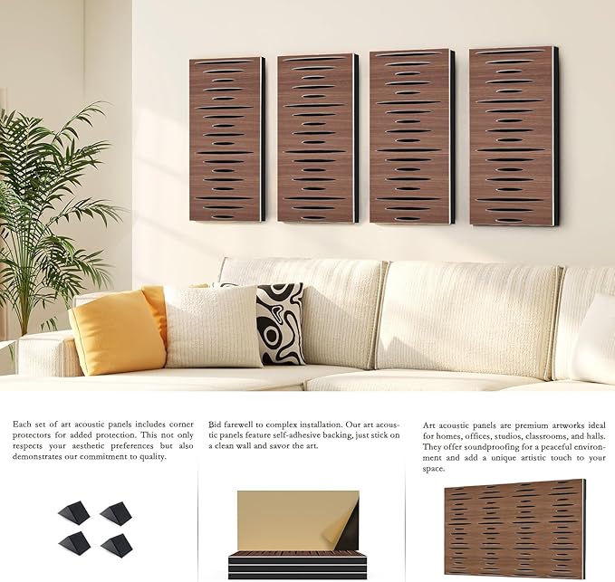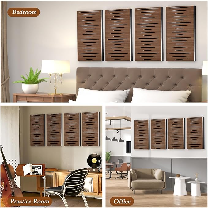 - 【Harmony in Multiple Scenarios】From professional acoustic studios to home cinema rooms, from study rooms to gaming room, innovative noise-reduction panels redefine spatial functionality through modular design, simultaneously achieving acoustic optimisation and aesthetic upgrades for various scenarios, creating a perfect balance between acoustic performance and spatial aesthetics. Not only do they enable immersive movie-watching and enhanced focus for work, but they also create a sophisticated backdrop for displays. Combining soundproofing, fire-resistant, and decorative functions, they replace the complex combination of traditional wood panelling, acoustic panel, and fire-resistant materials