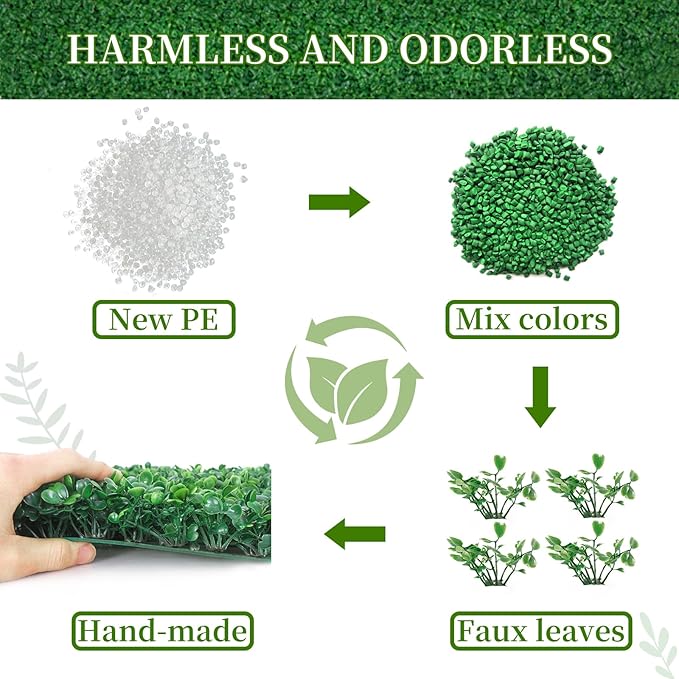 - UV Protected: Crafted from high-quality, this UV-protected faux grass wall panel is durable and ideal for long-term outdoor use, bringing lasting natural beauty to your space. A slight odor may occur due to shipping or weather—simply air it outdoors briefly upon unboxing