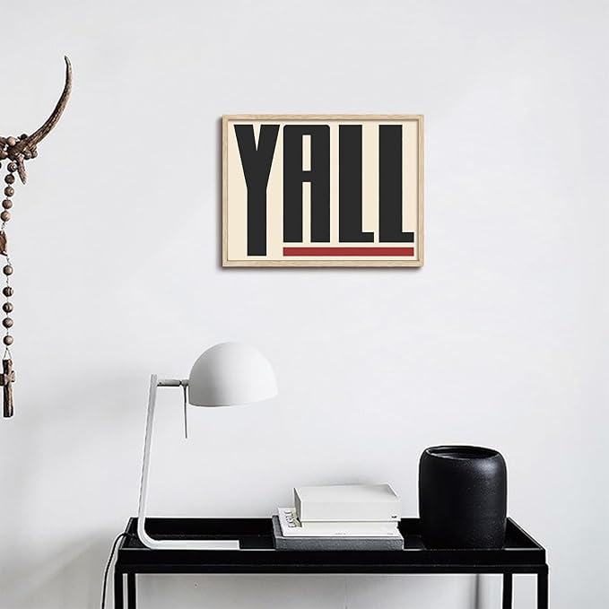 - Western Typography Framed Wall Art, Warm Southern Vibe, Features bold "YALL" text with retro typography. Creates a friendly, nostalgic atmosphere—ideal for living rooms, entryways, or home bars.