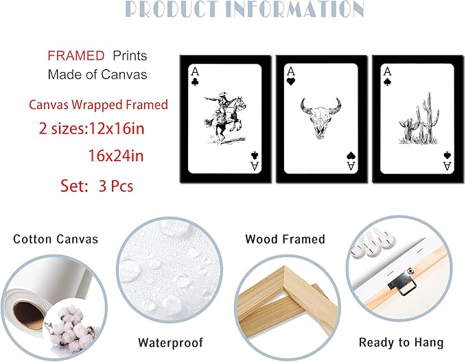 3Pcs Western Cowboy Canvas Wall Art Rustic Southwestern Style Poster Funny Creative Poker Ace Print Retro Western Aesthetic Image Cowboy Horse Bull Skull Cactus Painting for Bedroom Living Room Bathroom 16x24in Framed