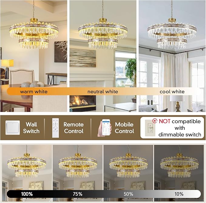 - 【3-colors temperature intelligent remote control + stepless dimming】 Switch 3000K warm yellow light (warm mode), 4500K natural light (dining mode), 6000K cold white light (reading mode) with one click through the remote control, smoothly adjust 10%-100% of the brightness, freely control from romantic night light to bright lighting, bid farewell to traditional gear restrictions to meet the lighting needs of all scenes
