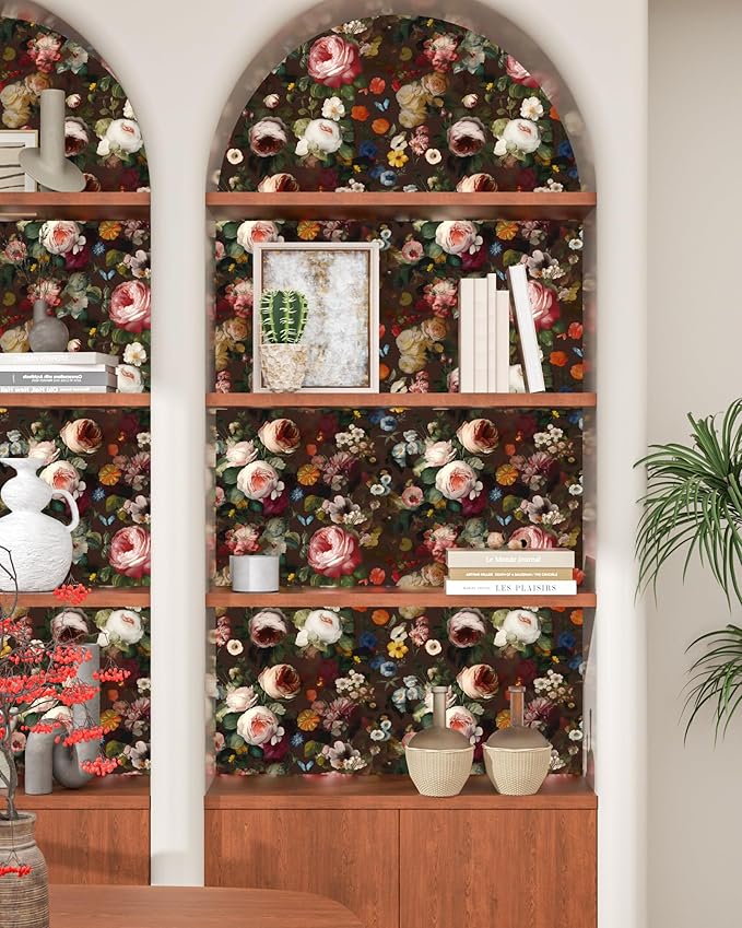 - SIZE AND PATTERN: Dark floral peel and stick wallpaper measures 17.5''x393''/roll. Vintage pattern unique design, provide ideas for room decoration. Patterned images repeat and can be spliced left, right, top and bottom. Tip: Due to the camera angle and scene color, floral contact paper will be a slight color difference, if you want to paste a large area, we suggest you buy a roll first to check if you like the color and pattern.