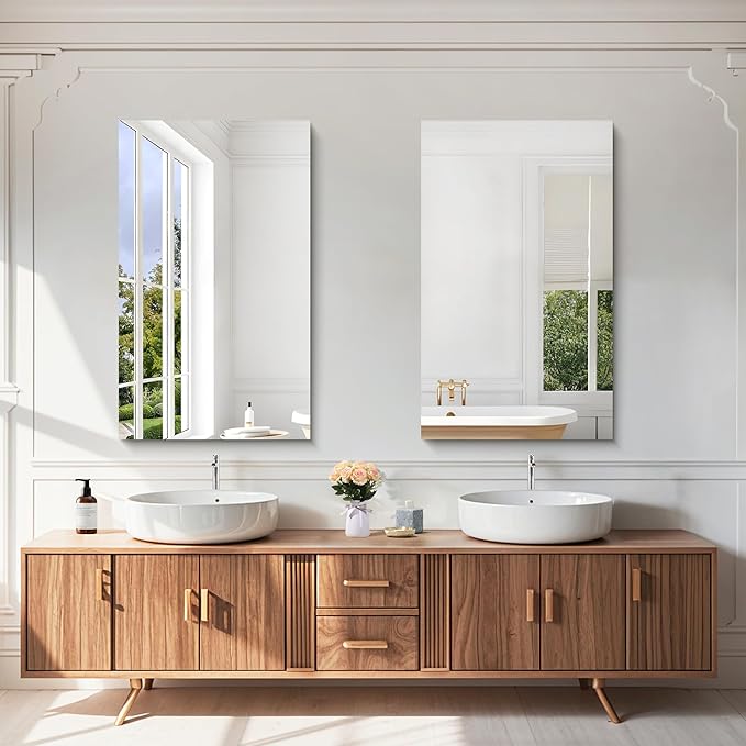 - HD 1:1 REFLECTION : KOCUUY frameless wall mirror offers a high-definition reflection. The premium mirror backing ensures a 1:1 real reflection with no distortion, giving you an clear and bright visual experience. This unframed mirrors are not only rust-resistant but also promise durability, making them ideal for high-humidity bathroom conditions.