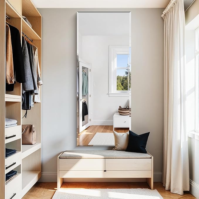 - PRECISION-BEVELED FRAMELESS MIRROR : Crafted with 1/4 inch (≈6mm) beveled edges, this mirror features precision-ground diamond brilliance. Unlike bulky edges, the slim bevel maintains structural integrity while enhancing visual continuity, creating seamless reflections without visual fragmentation.(Bevel width may vary slightly by batch.)