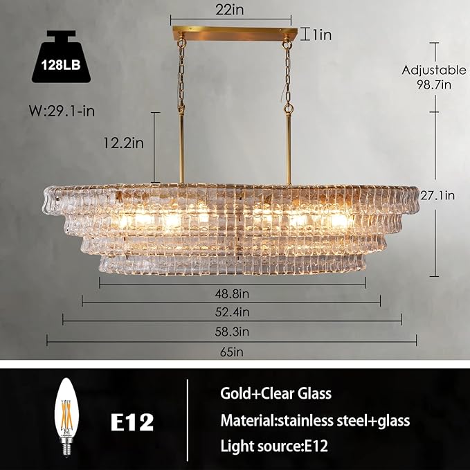 65 Inch Large Rectangular Gold Chandelier for Dining Room, Clear Glass Drum Modern Pendant Light Fixture, Extra Long Kitchen Island Lighting