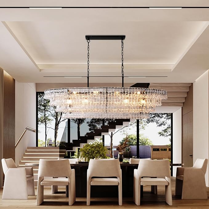 65 Inch Large Rectangular Black Chandelier for Dining Room, Clear Glass Drum Modern Pendant Light Fixture, Extra Long Kitchen Island Lighting