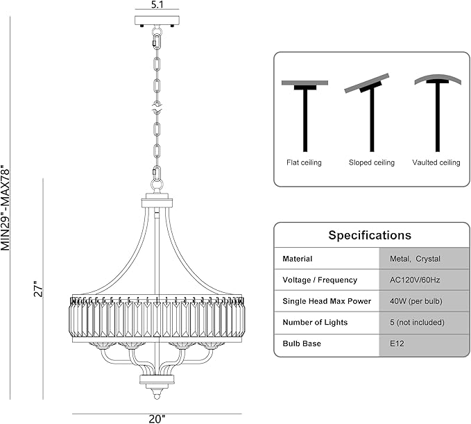 - 【Bulb Requirement】our modern chandeliers for dining room features 5*E12 bases that are compatible with various bulb types, such as incandescent, LED, CFL, and halogen bulbs (Bulbs NOT Included). the dining table chandelier also compatible with dimmer, you can use a dimmable bulb to create a warm and relaxed atmosphere (Dimmer switch need to buy separately).