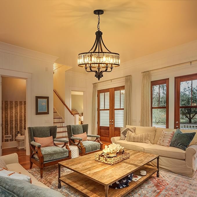 - 【Modern sophistication and Ingenious Lighting】: This black crystal chandelier features a matte black finish for understated elegance, effortlessly complementing modern, rustic, or industrial decor. The exquisite crystal discs atop the lamp base securely hold the tapered crystal ornaments, infusing the design with vintage refinement. while the conical crystals' intricate refraction creates dazzling ripples of light throughout the space. It crafts a warm dining ambiance over the table, elevates gatherings in the living room with grandeur, and transforms bedrooms into luxurious focal points. Every flowing shadow and light meticulously outlines the elevated quality of life.
