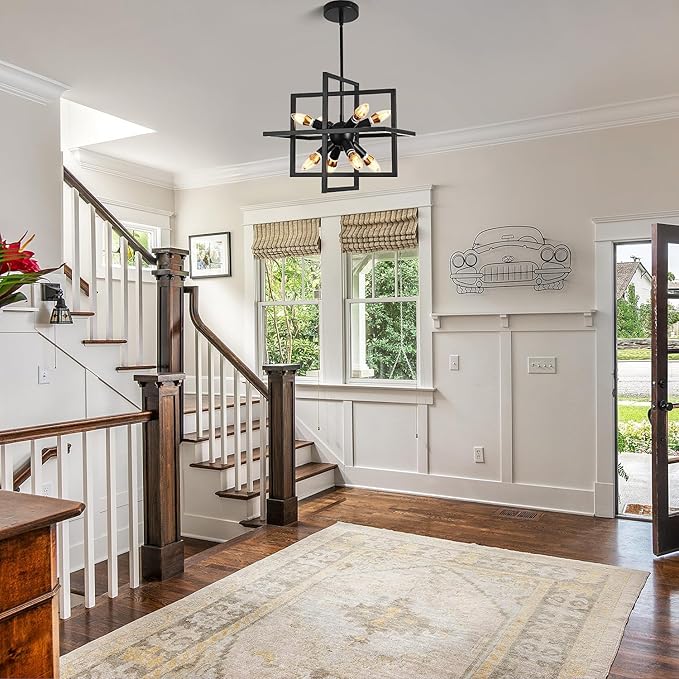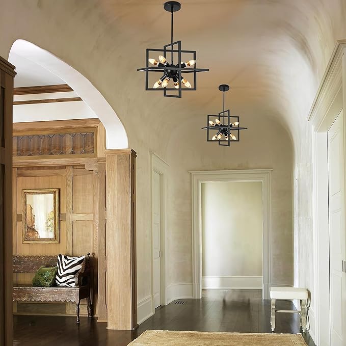 - [Modern Style]:The Geometric Industrial chandelier with modern open-air design, which makes it look simple and classic, better emits soft light to anywhere of your home, such as kitchen island, foyer, entry way, hallway, living room, dining room