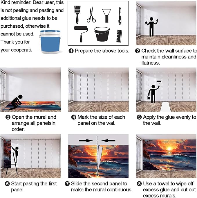 - DIY Murals: Wallpaper is not pre-pasted (need to be purchased by yourself), before installing the mural, please make sure the wall is flat, clean, dry and dust-free. Apply thick wall glue on the wall, slide the wallpaper into place to match the pattern