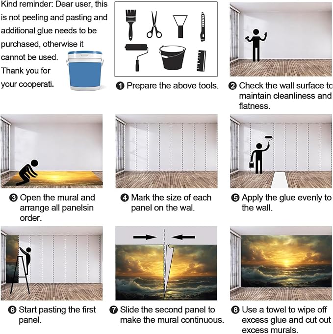 - DIY Murals: Wallpaper is not pre-pasted (need to be purchased by yourself), before installing the mural, please make sure the wall is flat, clean, dry and dust-free. Apply thick wall glue on the wall, slide the wallpaper into place to match the pattern
