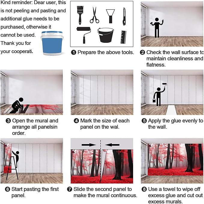 - DIY Murals: Wallpaper is not pre-pasted (need to be purchased by yourself), before installing the mural, please make sure the wall is flat, clean, dry and dust-free. Apply thick wall glue on the wall, slide the wallpaper into place to match the pattern