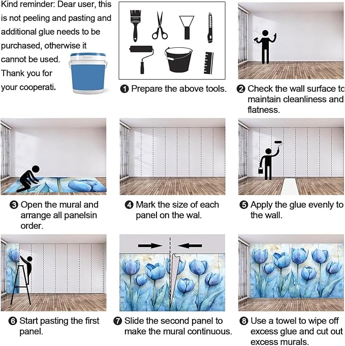 - DIY Murals: Wallpaper is not pre-pasted (need to be purchased by yourself), before installing the mural, please make sure the wall is flat, clean, dry and dust-free. Apply thick wall glue on the wall, slide the wallpaper into place to match the pattern