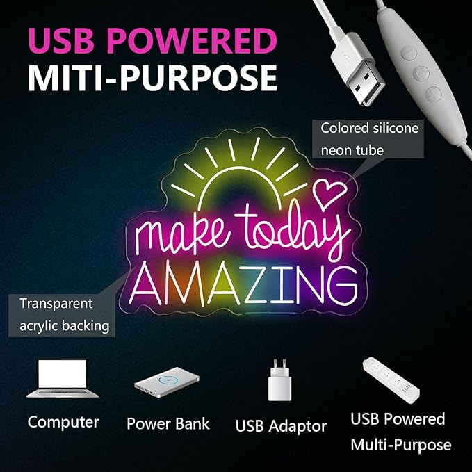 - Amazing Design:"Make today amazing" mixed with stunning rainbow hues exudes positivity and energy. The eye-catching rainbows glow neon lights are harmoniously designed with a sense of layering, which can catch the eye and create a lively and pleasant atmosphere.