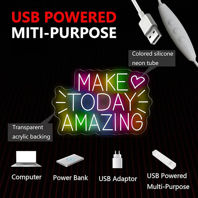 - Amazing Design:"Make today amazing" mixed with stunning rainbow hues exudes positivity and energy. The eye-catching rainbows glow neon lights are harmoniously designed with a sense of layering, which can catch the eye and create a lively and pleasant atmosphere.