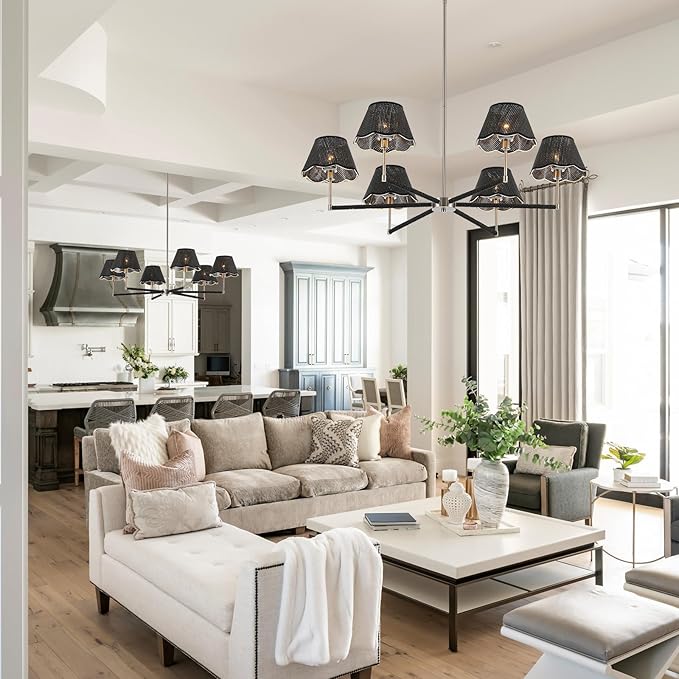 - Hand Woven: This wagon wheel chandelier features a round shape adorned with six delightful mushroom-shaped flower shades, adding a cute and lively touch to your home while infusing a vibrant and fresh atmosphere. The rattan is intricately woven into shades and black ropes into lamp arms, 2-hour hand woven by artisans, giving the chandelier a natural and modern appeal.