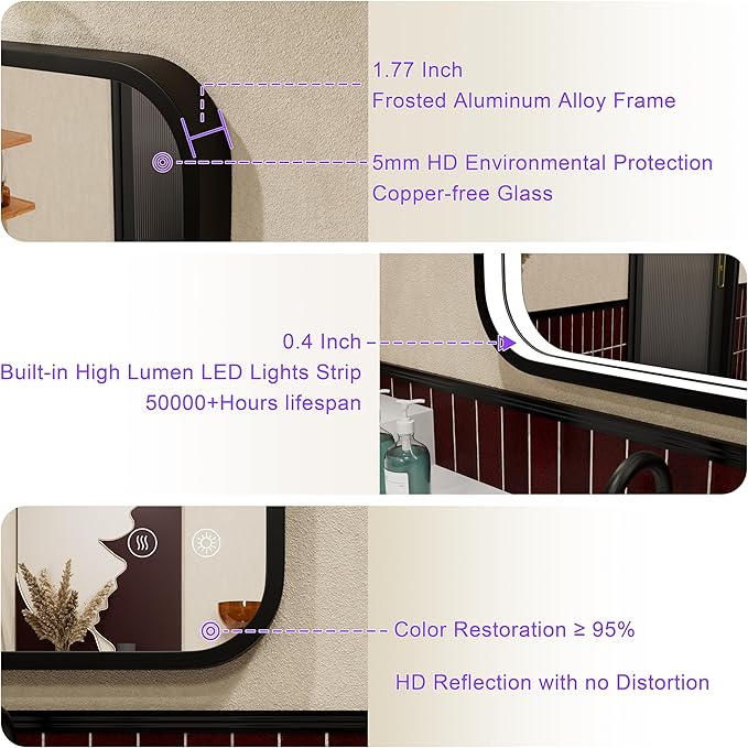 - [Safety defogging function] The LED mirror is equipped with a built-in defogging heater, ensuring clear reflection even in humid environments; Automatic shutdown after continuous use for 1 hour, safe and energy-saving