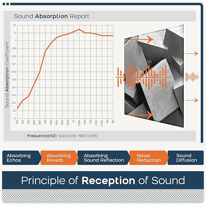 - đ»ăSound Absorbingă Our art acoustic panels which can easily and effectively reduce reverberation diffusion and echo, absorbing noise for walls. Effectively improve your sound environment and quality.Absorption Frequency: 150-20000HZ.It has better effect than acoustic foam
