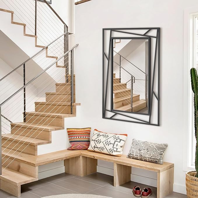 Black Bathroom Mirror for Wall 28''X20'' Matte Black Rectangle Wall Mirror with Geometric Metal Frame, Anti-Rust, Hang Horizontally or Vertically