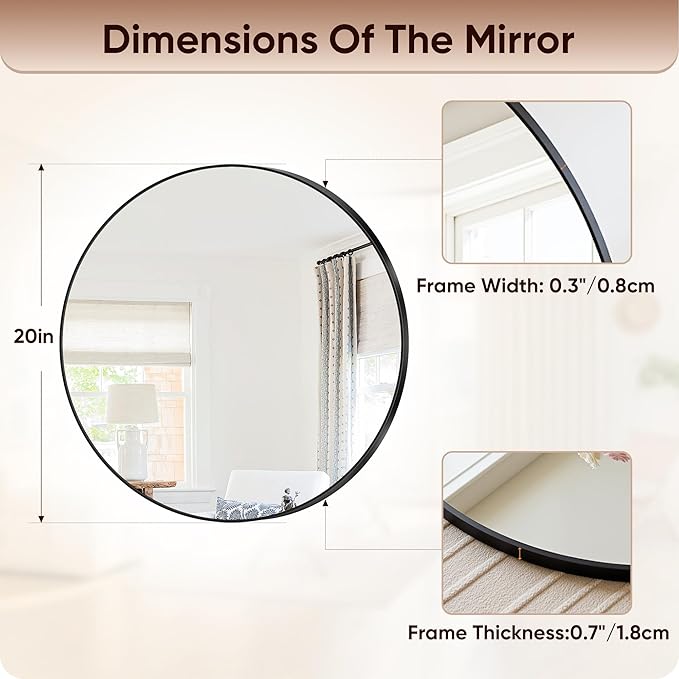 Antok Wall Mirror, 20"x20" Bathroom Vanity Mirror, Anti-Rust HD Tempered Glass, Wall Mounted Mirrors for Living Room, Entryway, Black Frame, Round