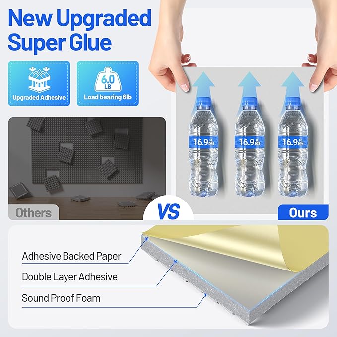 - 💪Super Strong Adhesive: Say goodbye to the trouble of the panel falling off! The adhesive layer of the sound proof foam panels for walls uses a newly upgraded strong double sided adhesive, which greatly improves the adhesion.No tools or additional adhesives are required, just peel off the kraft paper backing and you can easily stick sound dampening panels to the wall, door, window or ceiling.