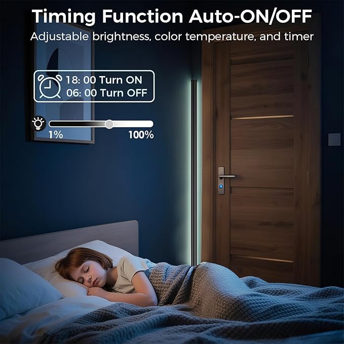 - 【Music Syncing & Light Timing】:The led floor lamp built-in high-sensitive microphone, while the corner floor lamp is on the music mode, the lights will dance with the music rhythm, which can create a romantic or a happy vibe, best for movie night or gaming room. With timing function this mood light allows to turn on or off automatically. So it can be a night light will accompanies you to sleep in the dark night and provide you sense of security and automatically turn off when you're asleep.