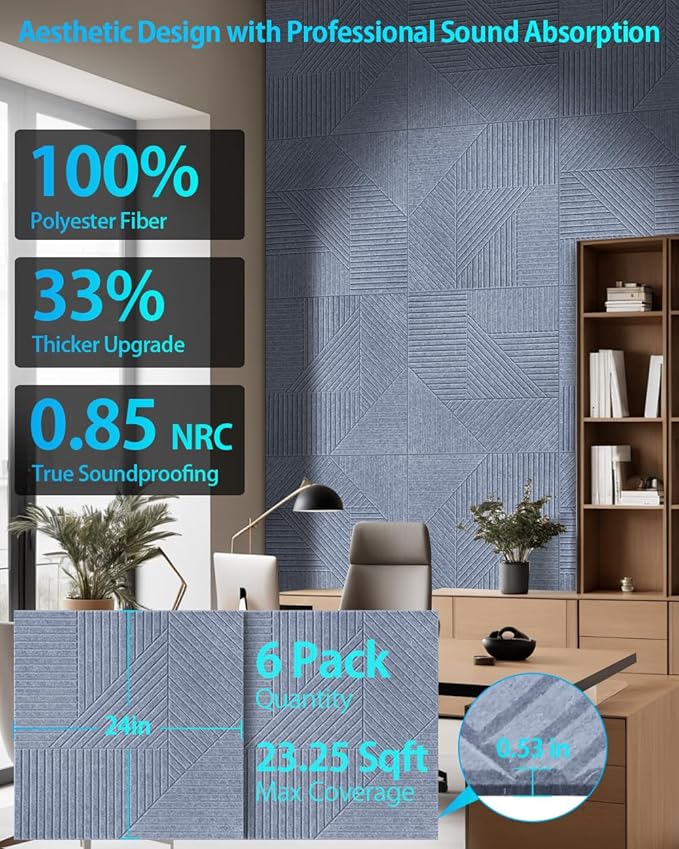 - Versatile for various rooms: A pack of 6 ( 23.6" x 23.6" ) sound absorbing panels provide 23.25 sq.ft. total coverage. Acoustic panel for walls ideal for improving audio clarity in studios, apartments, bedrooms and living rooms