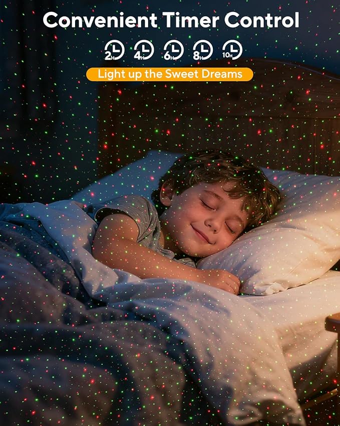 - Remote Control & Auto Timer: Control your holiday projector light easily with the included remote—switch colors, adjust movement speed, and choose between static or dynamic modes. The timer function lets you set automatic shutoff for 2, 4, 6, 8, or 10 hours, making it convenient and energy-saving for nightly displays.