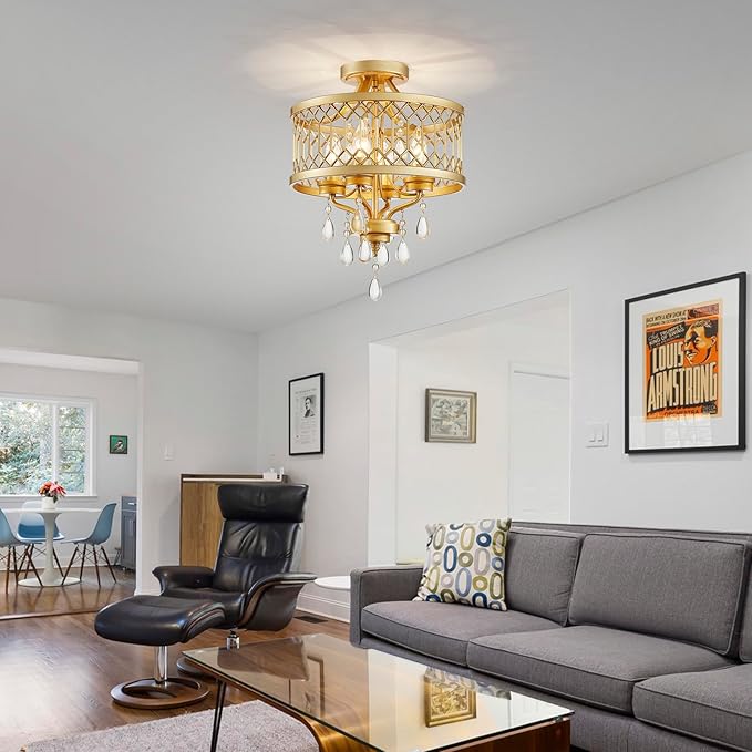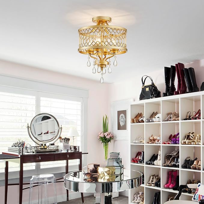 Crystal Ceiling Light Fixture, Farmhouse Semi Flush Mount Ceiling Light, Gold Crystal Chandeliers for Dining Room Light Fixture, Hallway Lighting Fixtures for Kitchen Bedroom Bathroom Foyer Entryway