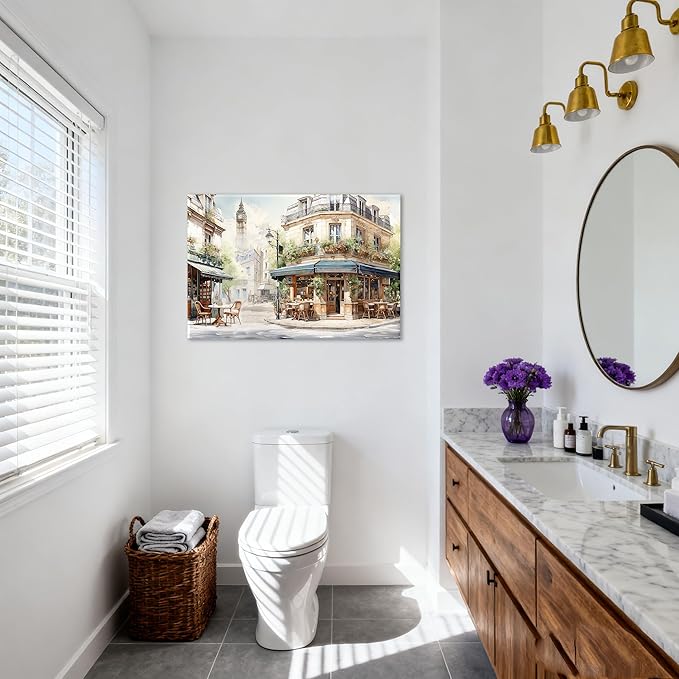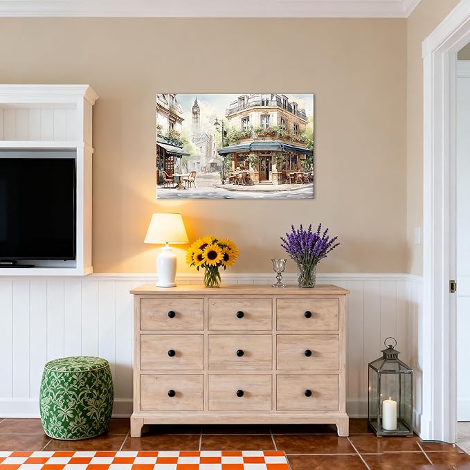 Modern Framed Street View Wall Art European Coffee Shop Canvas Print, Contemporary City Scene Painting, Vintage Cafe Artwork for Kitchen Dining Room Living Room, Bedroom Home Decor, Multi Size