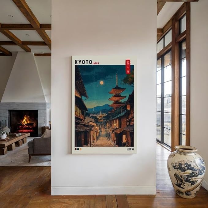 Nationcog Kyoto Japan Poster, Hokan-ji Temple Pagoda Wall Art Print, Vintage Japanese Night Street Landscape, Japandi Style Travel Decor for Bedroom or Living Room (Unframed) (24x36)