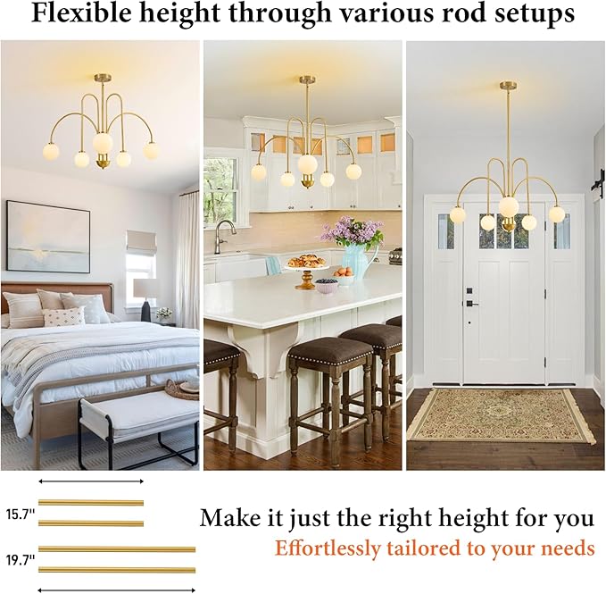 - Perfect Size and Adjustable Height: Measuring 40 inches in diameter with an adjustable height from 19.7 inches to 74.8 inches, this brass dining room chandelier suits both low and high ceilings. It includes six frosted glass globes—three at 4.72 inches and three at 3.94 inches—for a balanced layered look. With four included downrods (two at 15.7 inches and two at 19.7 inches), this mid century modern pendant light fixture allows flexible combinations to customize the hanging height, ensuring a perfect fit over your dining table, kitchen island, living room, staircases, entryways, or foyer.