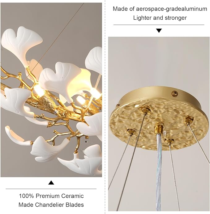 - High-Quality Materials:Our gold ginkgo leaf chandelier is crafted from premium ceramic and aerospace-grade aluminum, ensuring durability and elegance.Each chandelier is meticulously handcrafted,making every piece a unique work of art. Experience the perfect blend of quality and design in your home lighting.If you have any installation issues,you can find us on Amazon,and we will resolve your concerns within 24 hours.