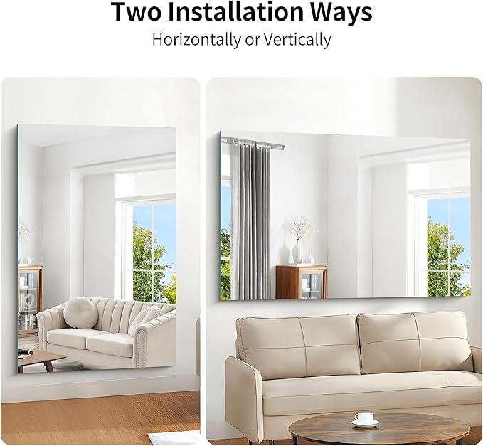 - EASY TO INSTALL AND SAFE PACKAGING : The packaging of this mirror without frame is well-designed and safe, with all-round protective Styrofoam and has passed the drop test. Don't worry about breakage. All of KOCUUY's rectangle mirrors can be hung horizontally or vertically. Super easy to install. Installation guide and screw bag are included in the package.