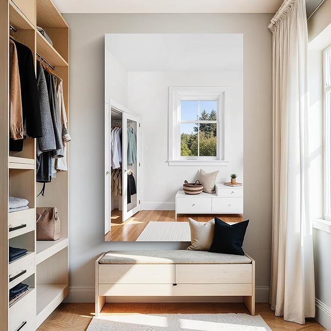 - SHATTERPROOF MIRROR : KOCUUY no-frame mirrors for wall are made of HD 3mm premium glass, which is lightweight and more eco-friendly than conventional mirrors. KOCUUY mirror is also upgraded with shatterproof feature which guaranteeing both secure handling.