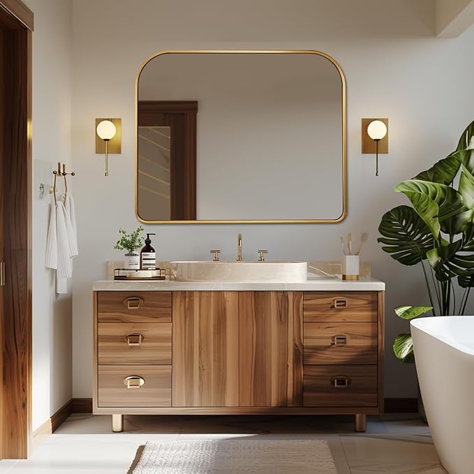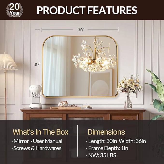 - No Distortion and Easily Hanging: All of our brushed gold vanity mirrors uses 4mm thick silver glass, making sure NO distortion. Four pre-installed reinforced D-Ring coming with all other hardware is included. If any missing in hardware, we would send out the new one for you asap (Quality Mirror, two people are recommended during installation)