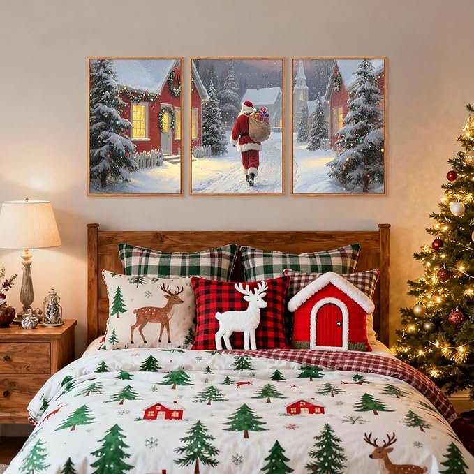 Aurlan Santa Claus is Coming to Town Framed Wall Art(16"x24"), 3PCS Vintage Christmas Winter Holiday Canvas Artwork, Large Xmas Snow Forest Cabin Cottagecore Decor for Home Office Bedroom